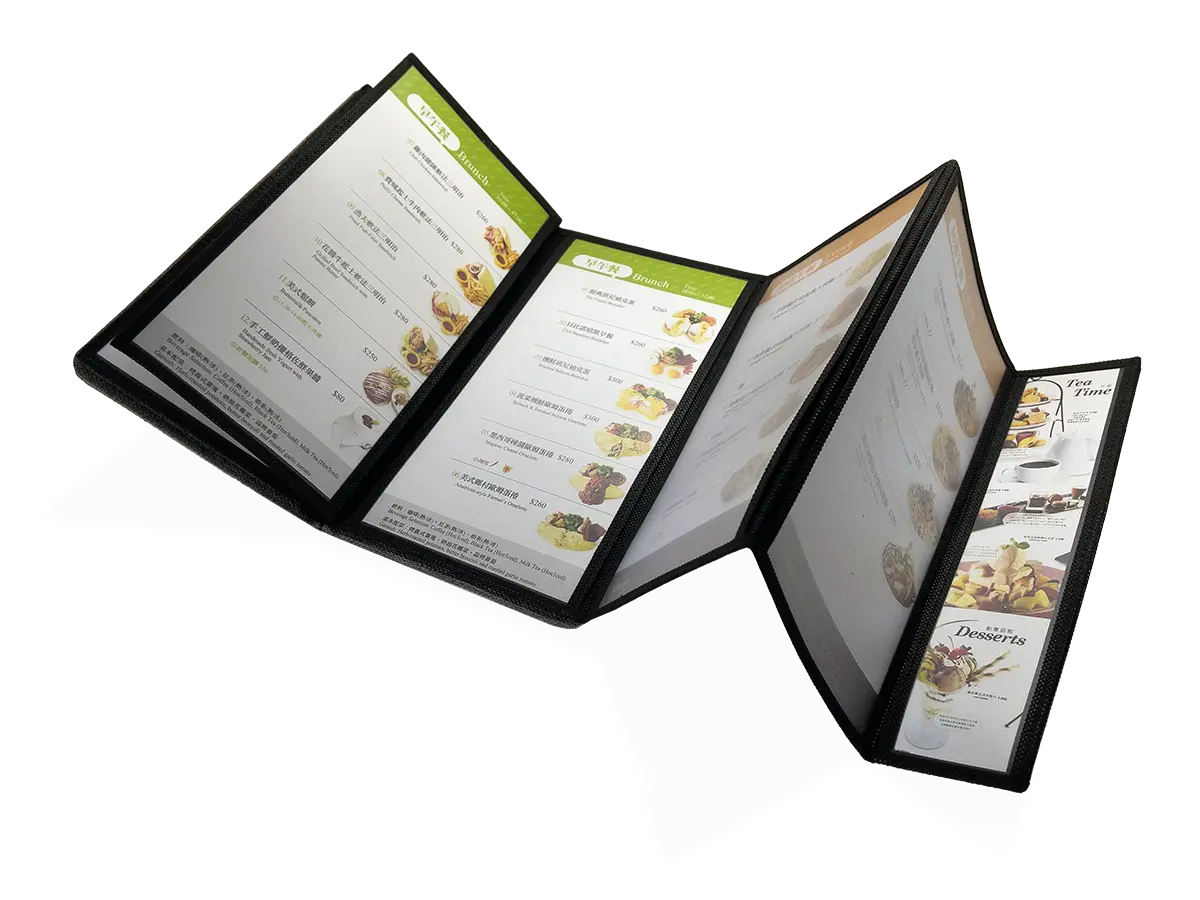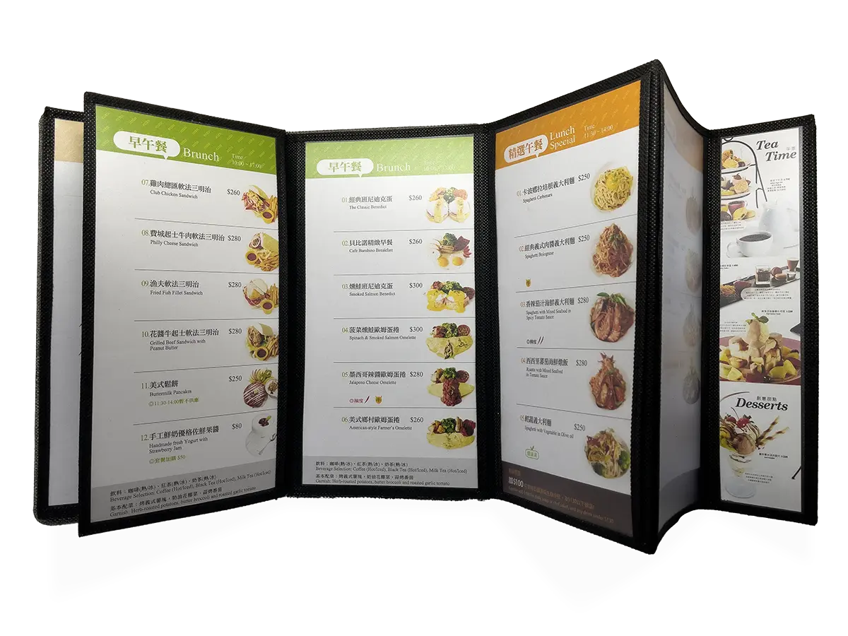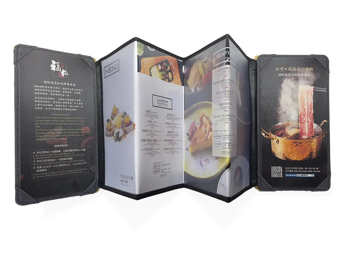 Since the widespread use of environmentally friendly non-woven fabric in 2000, a new option has emerged in the menu industry: the Invincible Menu. Non-woven fabric has proven to be superior to PVC material commonly used in American-style menus, and thus this unique feature is named the “Invincible Menu,” becoming a new trend in menu production. The manufacturing process of the Invincible Menu is similar to that of American-style menus. However, while American-style menus are usually made of PVC film, which quickly oxidizes and cracks after use, Invincible Menus utilize non-woven fabric, which is flexible and highly durable, making it easy to flip through the pages multiple times. The Invincible Menu is also unique in that it can be combined with creative book covers to form a bound menu book. This design enables individual page replacement without having to replace the entire menu, making it not only environmentally friendly but also convenient for restaurant managers to maintain and update. Overall, the Invincible Menu retains the essential functions of traditional menus while continuously innovating and updating, making it a more environmentally friendly, convenient, and practical way to produce menus.